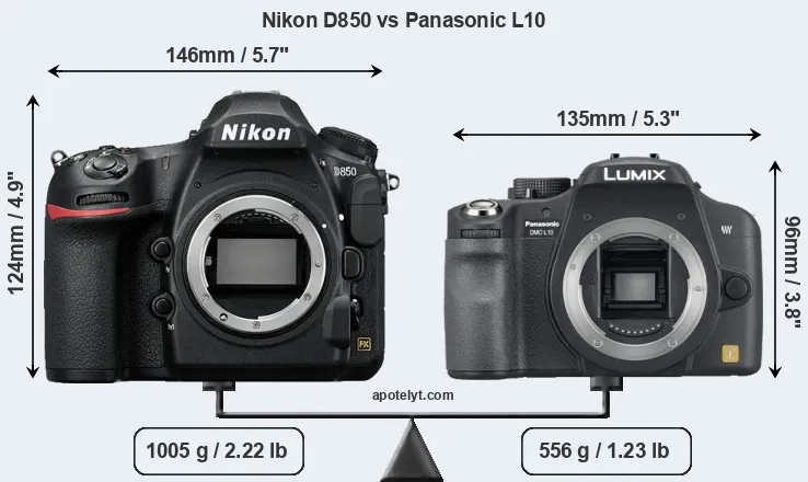 The side-by-side display below illustrates the physical size and weight of the Nikon D850 and the Panasonic L10. The two cameras are presented according to their relative size. Three successive views from the front, the top, and the rear are shown. All width, height and depth dimensions are rounded to the nearest millimeter.