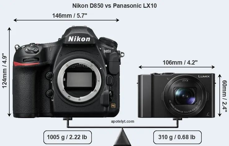 The physical size and weight of the Nikon D850 and the Panasonic LX10 are illustrated in the side-by-side display below. The two cameras are presented according to their relative size. Three consecutive perspectives from the front, the top, and the back are available. All width, height and depth measures are rounded to the nearest millimeter.
