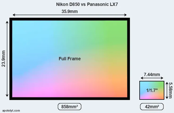 Of the two cameras under consideration, the Nikon D850 features a full frame sensor and the Panasonic LX7 a 1/1.7-inch sensor. The sensor area in the LX7 is 95 percent smaller. As a result of these sensor size differences, the cameras have a format factor of, respectively, 1.0 and 4.65. The sensor in the D850 has a native 3:2 aspect ratio, while the one in the LX7 offers a 4:3 aspect. The LX7 has the particularity of featuring a switch that allows to toggle between multiple aspect ratios, while maintaining the same field of view and full image resolution.