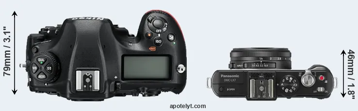 The side-by-side display below illustrates the physical size and weight of the Nikon D850 and the Panasonic LX7. The two cameras are presented according to their relative size. Three consecutive perspectives from the front, the top, and the back are available. All size dimensions are rounded to the nearest millimeter.