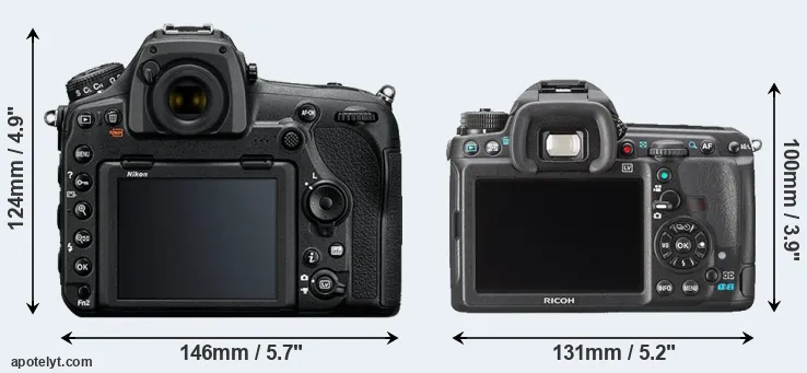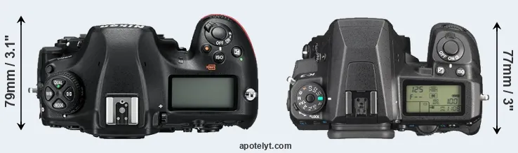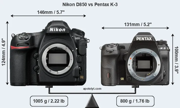 The side-by-side display below illustrates the physical size and weight of the Nikon D850 and the Pentax K-3. The two cameras are presented according to their relative size. Three consecutive views from the front, the top, and the rear side are shown. All width, height and depth measures are rounded to the nearest millimeter.