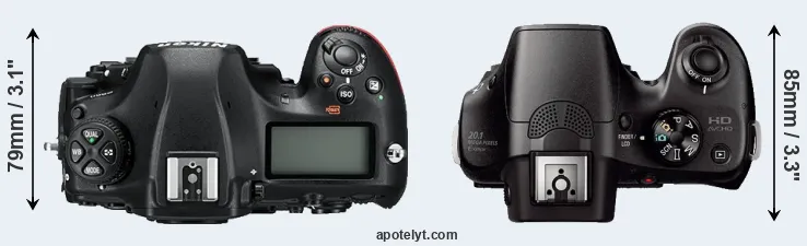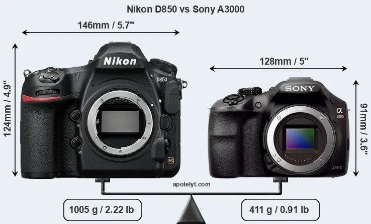 An illustration of the physical size and weight of the Nikon D850 and the Sony A3000 is provided in the side-by-side display below. The two cameras are presented according to their relative size. Three consecutive perspectives from the front, the top, and the back are available. All size dimensions are rounded to the nearest millimeter.