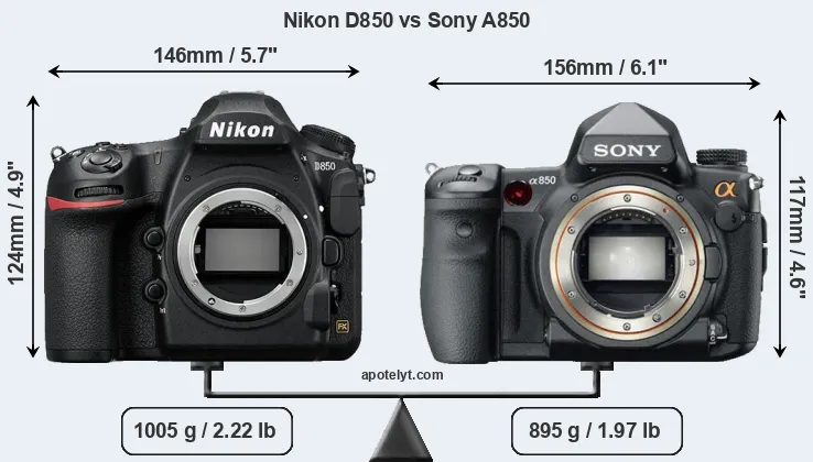The physical size and weight of the Nikon D850 and the Sony A850 are illustrated in the side-by-side display below. The two cameras are presented according to their relative size. Three consecutive views from the front, the top, and the rear side are shown. All width, height and depth measures are rounded to the nearest millimeter.