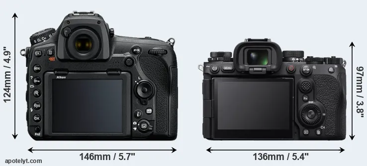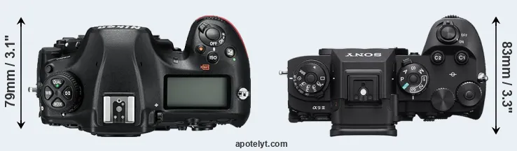 The side-by-side display below illustrates the physical size and weight of the Nikon D850 and the Sony A9 III. The two cameras are presented according to their relative size. Three consecutive perspectives from the front, the top, and the back are available. All width, height and depth measures are rounded to the nearest millimeter.