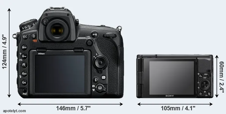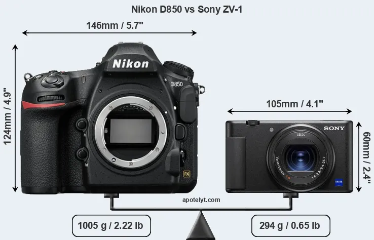The physical size and weight of the Nikon D850 and the Sony ZV-1 are illustrated in the side-by-side display below. The two cameras are presented according to their relative size. Three consecutive perspectives from the front, the top, and the back are available. All width, height and depth measures are rounded to the nearest millimeter.
