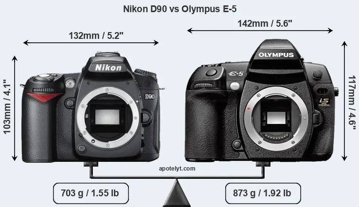 The side-by-side display below illustrates the physical size and weight of the Nikon D90 and the Olympus E-5. The two cameras are presented according to their relative size. Three consecutive views from the front, the top, and the rear side are shown. All width, height and depth measures are rounded to the nearest millimeter.