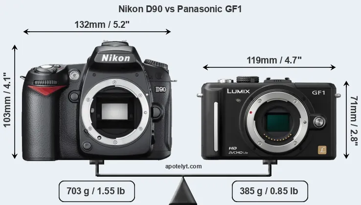 The physical size and weight of the Nikon D90 and the Panasonic GF1 are illustrated in the side-by-side display below. The two cameras are presented according to their relative size. Three successive views from the front, the top, and the rear are shown. All size dimensions are rounded to the nearest millimeter.