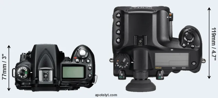 The side-by-side display below illustrates the physical size and weight of the Nikon D90 and the Pentax 645D. The two cameras are presented according to their relative size. Three consecutive views from the front, the top, and the rear side are shown. All width, height and depth measures are rounded to the nearest millimeter.