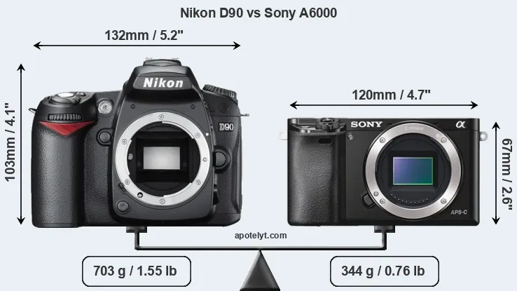 The side-by-side display below illustrates the physical size and weight of the Nikon D90 and the Sony A6000. The two cameras are presented according to their relative size. Three successive views from the front, the top, and the rear are shown. All width, height and depth dimensions are rounded to the nearest millimeter.
