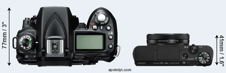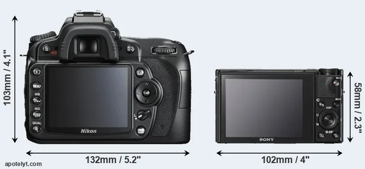 The side-by-side display below illustrates the physical size and weight of the Nikon D90 and the Sony RX100 V. The two cameras are presented according to their relative size. Three consecutive perspectives from the front, the top, and the back are available. All width, height and depth measures are rounded to the nearest millimeter.
