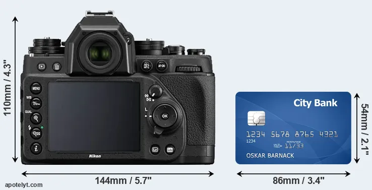 The side-by-side display below illustrates the physical size of the Nikon Df vis-à-vis a credit card. Three successive views from the front, the top, and the rear are shown. All width, height and depth measures are rounded to the nearest millimeter.