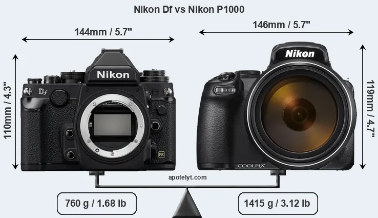 An illustration of the physical size and weight of the Nikon Df and the Nikon P1000 is provided in the side-by-side display below. The two cameras are presented according to their relative size. Three consecutive views from the front, the top, and the rear side are shown. All width, height and depth dimensions are rounded to the nearest millimeter.