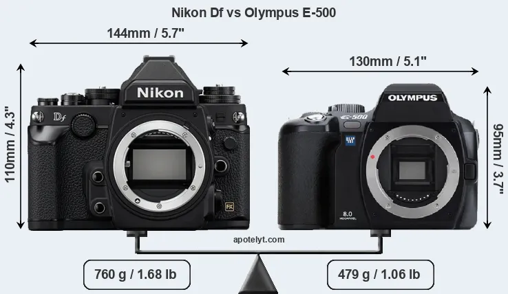 The side-by-side display below illustrates the physical size and weight of the Nikon Df and the Olympus E-500. The two cameras are presented according to their relative size. Three consecutive views from the front, the top, and the rear side are shown. All width, height and depth dimensions are rounded to the nearest millimeter.