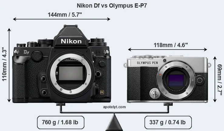 If the front view area (width x height) of the cameras is taken as an aggregate measure of their size, the Olympus E-P7 is considerably smaller (49 percent) than the Nikon Df. Moreover, the E-P7 is substantially lighter (56 percent) than the Df. It is worth mentioning in this context that the Df is splash and dust resistant, while the E-P7 does not feature any corresponding weather-sealing.