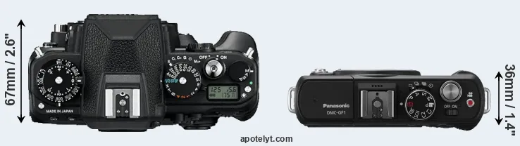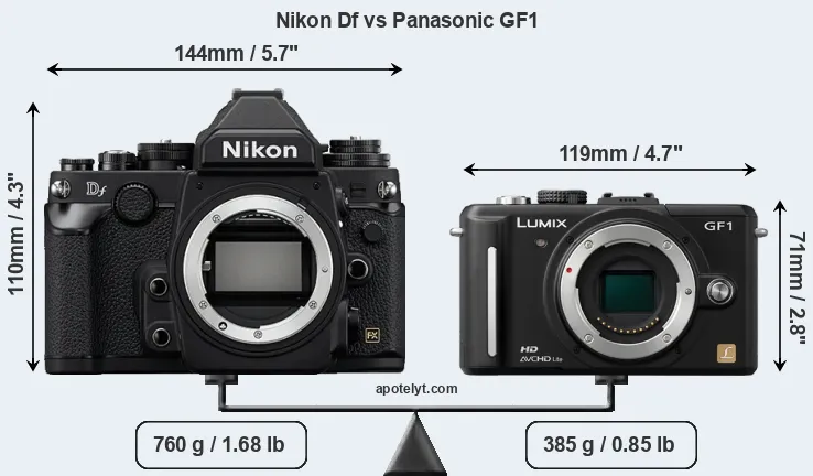 An illustration of the physical size and weight of the Nikon Df and the Panasonic GF1 is provided in the side-by-side display below. The two cameras are presented according to their relative size. Three consecutive perspectives from the front, the top, and the back are available. All width, height and depth measures are rounded to the nearest millimeter.