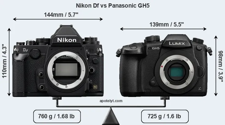The physical size and weight of the Nikon Df and the Panasonic GH5 are illustrated in the side-by-side display below. The two cameras are presented according to their relative size. Three consecutive perspectives from the front, the top, and the back are available. All size dimensions are rounded to the nearest millimeter.