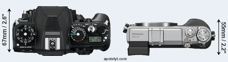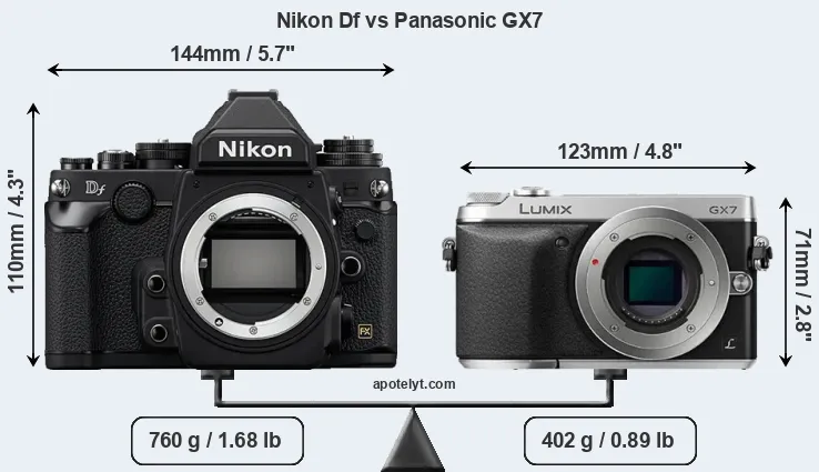 If the front view area (width x height) of the cameras is taken as an aggregate measure of their size, the Panasonic GX7 is considerably smaller (45 percent) than the Nikon Df. Moreover, the GX7 is substantially lighter (47 percent) than the Df. It is worth mentioning in this context that the Df is splash and dust resistant, while the GX7 does not feature any corresponding weather-sealing.