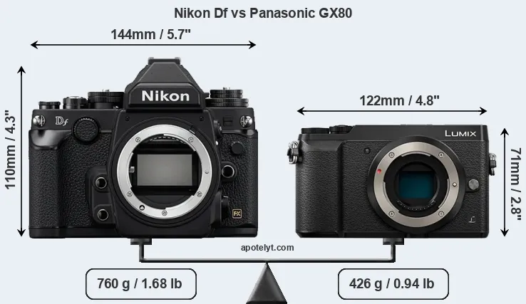If the front view area (width x height) of the cameras is taken as an aggregate measure of their size, the Panasonic GX80 is considerably smaller (45 percent) than the Nikon Df. Moreover, the GX80 is substantially lighter (44 percent) than the Df. It is worth mentioning in this context that the Df is splash and dust resistant, while the GX80 does not feature any corresponding weather-sealing.