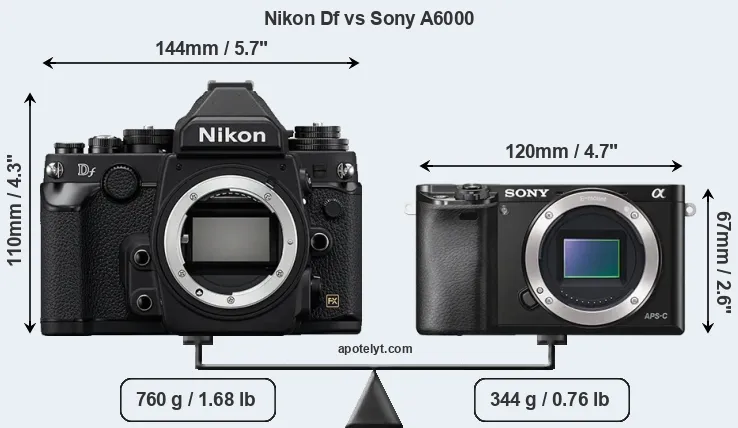 If the front view area (width x height) of the cameras is taken as an aggregate measure of their size, the Sony A6000 is considerably smaller (49 percent) than the Nikon Df. Moreover, the A6000 is substantially lighter (55 percent) than the Df. It is worth mentioning in this context that the Df is splash and dust resistant, while the A6000 does not feature any corresponding weather-sealing.