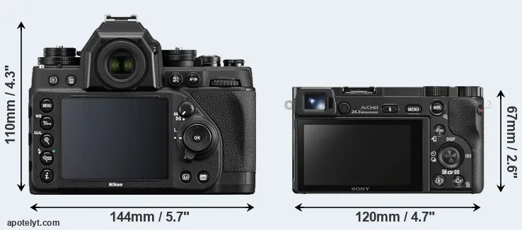 An illustration of the physical size and weight of the Nikon Df and the Sony A6000 is provided in the side-by-side display below. The two cameras are presented according to their relative size. Three successive views from the front, the top, and the rear are shown. All width, height and depth dimensions are rounded to the nearest millimeter.