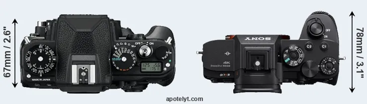 The side-by-side display below illustrates the physical size and weight of the Nikon Df and the Sony A7R IV. The two cameras are presented according to their relative size. Three successive views from the front, the top, and the rear are shown. All width, height and depth dimensions are rounded to the nearest millimeter.