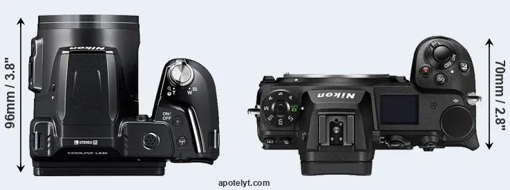 The side-by-side display below illustrates the physical size and weight of the Nikon L840 and the Nikon Z6 II. The two cameras are presented according to their relative size. Three successive views from the front, the top, and the rear are shown. All width, height and depth measures are rounded to the nearest millimeter.