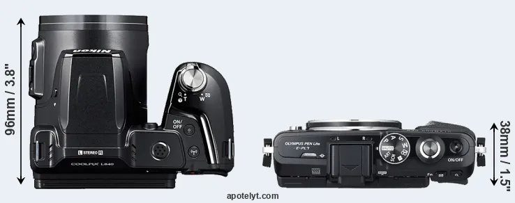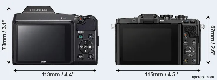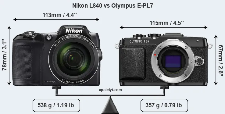 The physical size and weight of the Nikon L840 and the Olympus E-PL7 are illustrated in the side-by-side display below. The two cameras are presented according to their relative size. Three consecutive perspectives from the front, the top, and the back are available. All width, height and depth dimensions are rounded to the nearest millimeter.