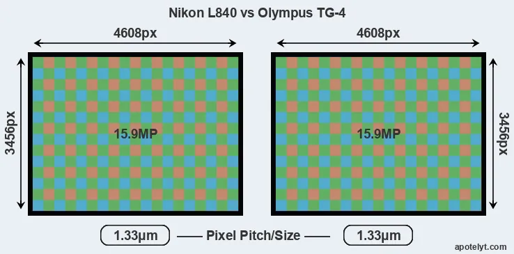 The two cameras under review do not only share the same sensor size, but also offer an identical resolution of 15.9 megapixels. This similarity in sensor specs implies that both the L840 and the TG-4 have the same pixel density, as well as the same pixel size. Moreover, the two cameras were released in close succession, so that their sensors are from the same technological generation. Coming back to sensor resolution, it should be mentioned that the L840 has no anti-alias filter installed, so that it can capture all the detail its sensor resolves.