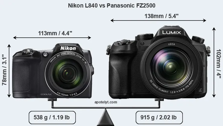 The physical size and weight of the Nikon L840 and the Panasonic FZ2500 are illustrated in the side-by-side display below. The two cameras are presented according to their relative size. Three successive views from the front, the top, and the rear are shown. All width, height and depth measures are rounded to the nearest millimeter.
