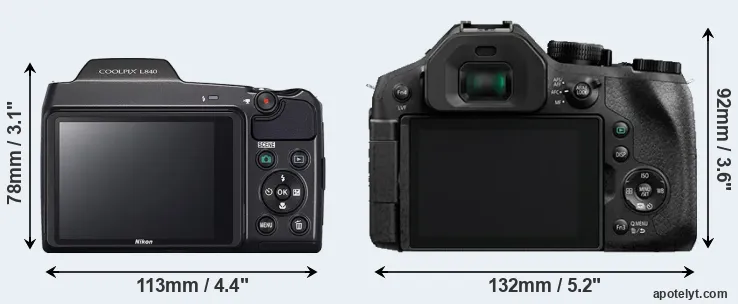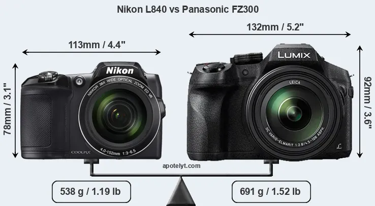 The physical size and weight of the Nikon L840 and the Panasonic FZ300 are illustrated in the side-by-side display below. The two cameras are presented according to their relative size. Three consecutive perspectives from the front, the top, and the back are available. All size dimensions are rounded to the nearest millimeter.