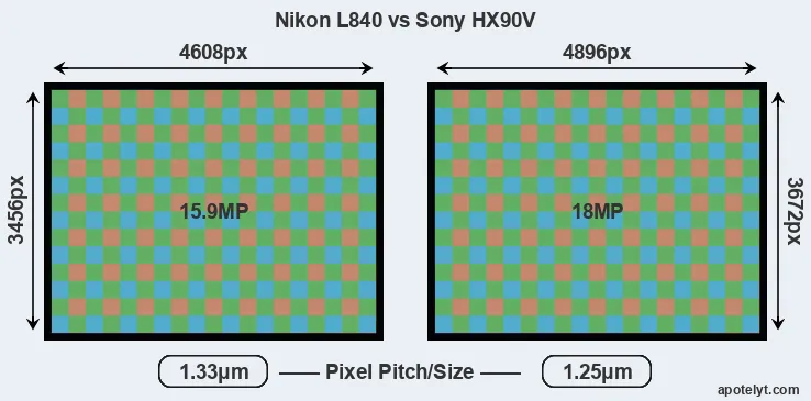 While the two cameras under review share the same sensor size, the HX90V offers a higher resolution of 18 megapixels, compared with 15.9 MP of the L840. This megapixels advantage translates into a 6 percent gain in linear resolution. On the other hand, these sensor specs imply that the HX90V has a higher pixel density and a smaller size of the individual pixel (with a pixel pitch of 1.25μm versus 1.33μm for the L840). It is noteworthy in this context that the two cameras were released in close succession, so that their sensors are from the same technological generation. Coming back to sensor resolution, it should be mentioned that neither of the two cameras has an anti-alias filter installed, so they are able to capture all the detail the sensor resolves.