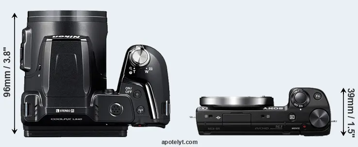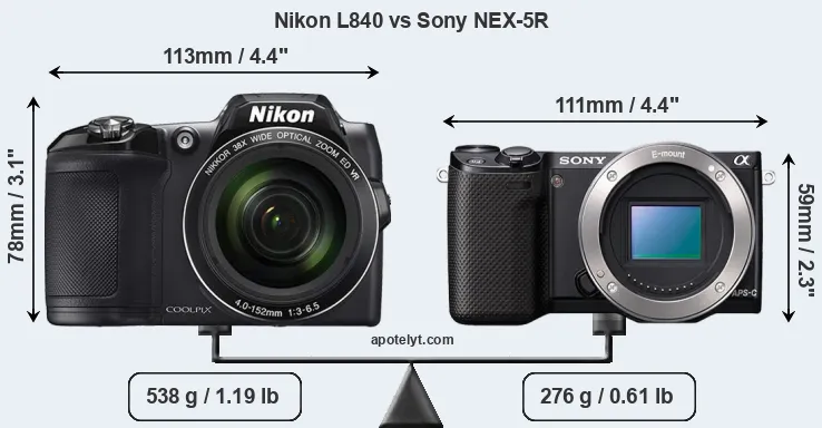 An illustration of the physical size and weight of the Nikon L840 and the Sony NEX-5R is provided in the side-by-side display below. The two cameras are presented according to their relative size. Three successive views from the front, the top, and the rear are shown. All size dimensions are rounded to the nearest millimeter.