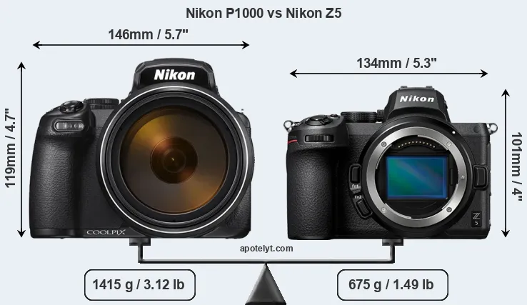 The Nikon Coolpix P1000 and the Nikon Z5 are two digital cameras that were officially introduced, respectively, in July 2018 and July 2020. The P1000 is a fixed lens compact, while the Z5 is a mirrorless interchangeable lens camera. The cameras are based on a 1/2.3-inch (P1000) and a full frame (Z5) sensor. The P1000 has a resolution of 15.9 megapixels, whereas the Z5 provides 24.2 MP.