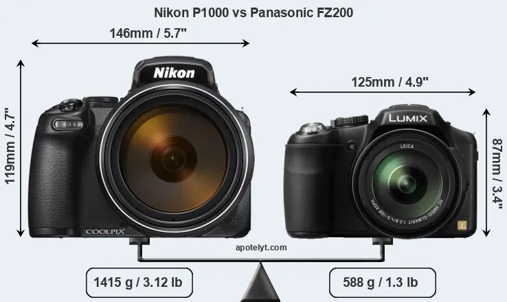 An illustration of the physical size and weight of the Nikon P1000 and the Panasonic FZ200 is provided in the side-by-side display below. The two cameras are presented according to their relative size. Three consecutive perspectives from the front, the top, and the back are available. All width, height and depth dimensions are rounded to the nearest millimeter.