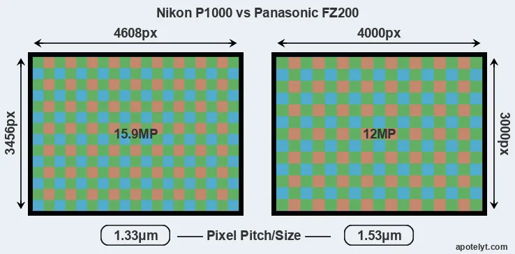 While the two cameras under review share the same sensor size, the P1000 offers a higher resolution of 15.9 megapixels, compared with 12 MP of the FZ200. This megapixels advantage translates into a 15 percent gain in linear resolution. On the other hand, these sensor specs imply that the P1000 has a higher pixel density and a smaller size of the individual pixel (with a pixel pitch of 1.33μm versus 1.53μm for the FZ200). In this context, it should be noted, however, that the P1000 is much more recent (by 5 years and 11 months) than the FZ200, and its sensor will have benefitted from technological advances during this time that compensate for the smaller pixel size. Coming back to sensor resolution, it should be mentioned that neither of the two cameras has an anti-alias filter installed, so they are able to capture all the detail the sensor resolves.
