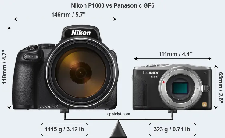 An illustration of the physical size and weight of the Nikon P1000 and the Panasonic GF6 is provided in the side-by-side display below. The two cameras are presented according to their relative size. Three consecutive perspectives from the front, the top, and the back are available. All width, height and depth dimensions are rounded to the nearest millimeter.