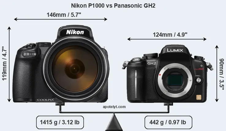 The physical size and weight of the Nikon P1000 and the Panasonic GH2 are illustrated in the side-by-side display below. The two cameras are presented according to their relative size. Three consecutive perspectives from the front, the top, and the back are available. All width, height and depth dimensions are rounded to the nearest millimeter.