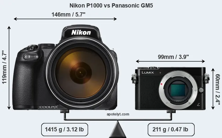The above size and weight comparisons are to some extent incomplete and possibly misleading, as the P1000 has a lens built in, whereas the GM5 is an interchangeable lens camera that requires a separate lens. Attaching the latter will add extra weight and bulk to the setup. You can compare the optics available for the GM5 and their specifications in the Micro Four Thirds Lens Catalog.