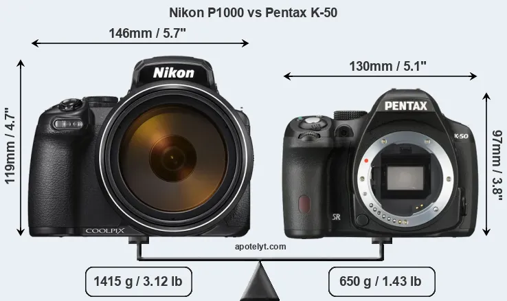An illustration of the physical size and weight of the Nikon P1000 and the Pentax K-50 is provided in the side-by-side display below. The two cameras are presented according to their relative size. Three successive views from the front, the top, and the rear are shown. All width, height and depth measures are rounded to the nearest millimeter.