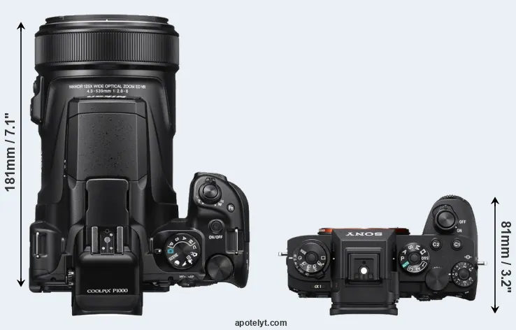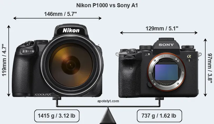 An illustration of the physical size and weight of the Nikon P1000 and the Sony A1 is provided in the side-by-side display below. The two cameras are presented according to their relative size. Three successive views from the front, the top, and the rear are shown. All width, height and depth dimensions are rounded to the nearest millimeter.