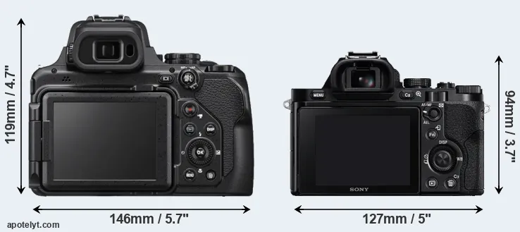 The above size and weight comparisons are to some extent incomplete and possibly misleading, as the P1000 has a lens built in, whereas the A7 is an interchangeable lens camera that requires a separate lens. Attaching the latter will add extra weight and bulk to the setup. You can compare the optics available for the A7 and their specifications in the Sony FE Lens Catalog.