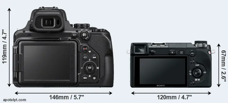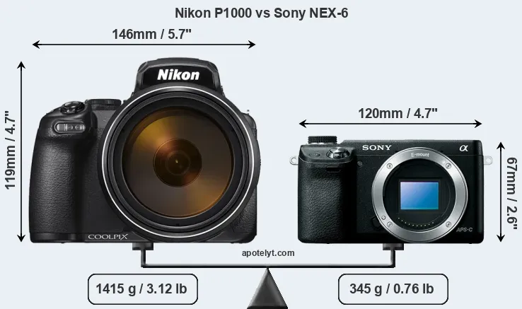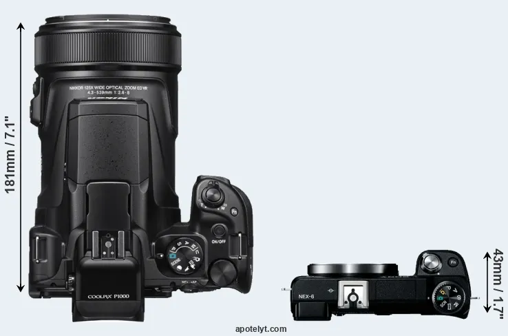 The side-by-side display below illustrates the physical size and weight of the Nikon P1000 and the Sony NEX-6. The two cameras are presented according to their relative size. Three consecutive perspectives from the front, the top, and the back are available. All width, height and depth measures are rounded to the nearest millimeter.