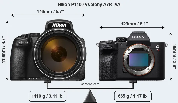 The above size and weight comparisons are to some extent incomplete and possibly misleading, as the P1100 has a lens built in, whereas the A7R IVA is an interchangeable lens camera that requires a separate lens. Attaching the latter will add extra weight and bulk to the setup. You can compare the optics available for the A7R IVA and their specifications in the Sony FE Lens Catalog.