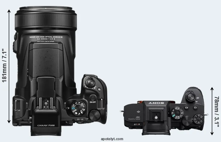The side-by-side display below illustrates the physical size and weight of the Nikon P1100 and the Sony A7R IVA. The two cameras are presented according to their relative size. Three successive views from the front, the top, and the rear are shown. All width, height and depth dimensions are rounded to the nearest millimeter.