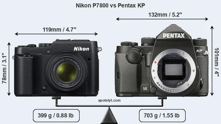 An illustration of the physical size and weight of the Nikon P7800 and the Pentax KP is provided in the side-by-side display below. The two cameras are presented according to their relative size. Three consecutive views from the front, the top, and the rear side are shown. All width, height and depth measures are rounded to the nearest millimeter.