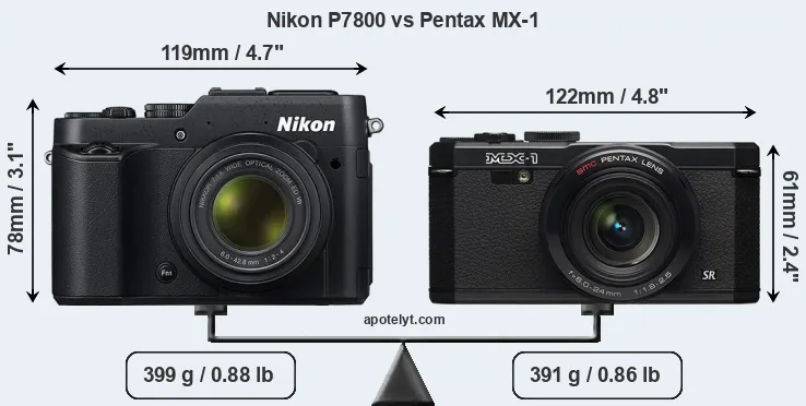 An illustration of the physical size and weight of the Nikon P7800 and the Pentax MX-1 is provided in the side-by-side display below. The two cameras are presented according to their relative size. Three consecutive views from the front, the top, and the rear side are shown. All width, height and depth measures are rounded to the nearest millimeter.