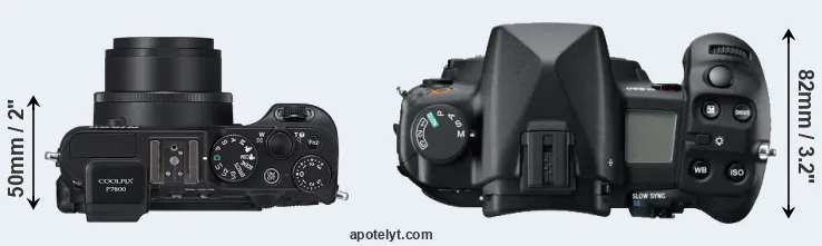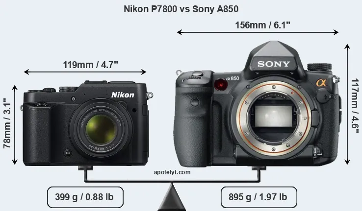 An illustration of the physical size and weight of the Nikon P7800 and the Sony A850 is provided in the side-by-side display below. The two cameras are presented according to their relative size. Three consecutive perspectives from the front, the top, and the back are available. All width, height and depth dimensions are rounded to the nearest millimeter.