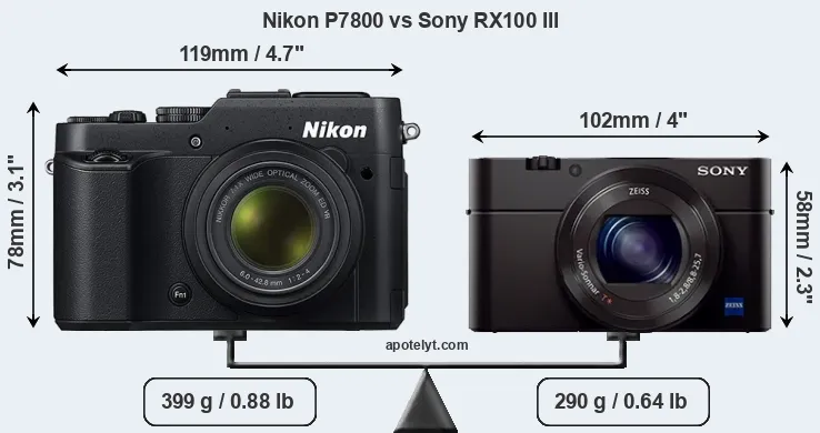 If the front view area (width x height) of the cameras is taken as an aggregate measure of their size, the Sony RX100 III is considerably smaller (36 percent) than the Nikon P7800. Moreover, the RX100 III is markedly lighter (27 percent) than the P7800. In this context, it is worth noting that neither the P7800 nor the RX100 III are weather-sealed.