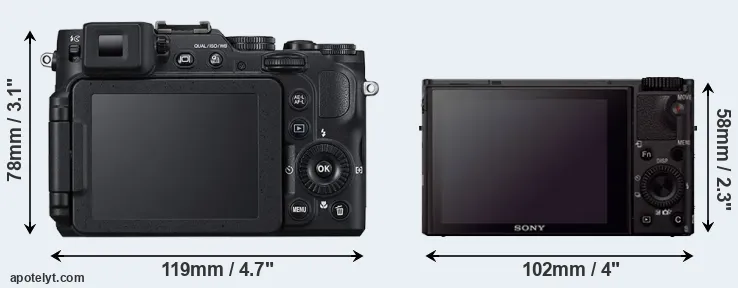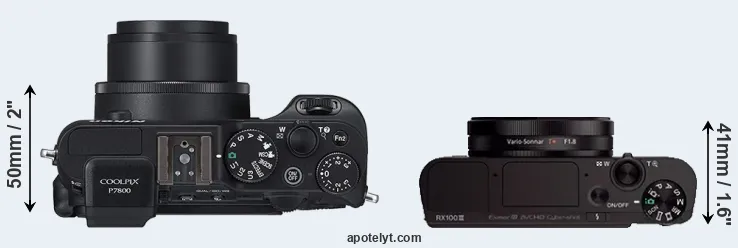 The physical size and weight of the Nikon P7800 and the Sony RX100 III are illustrated in the side-by-side display below. The two cameras are presented according to their relative size. Three consecutive perspectives from the front, the top, and the back are available. All size dimensions are rounded to the nearest millimeter.