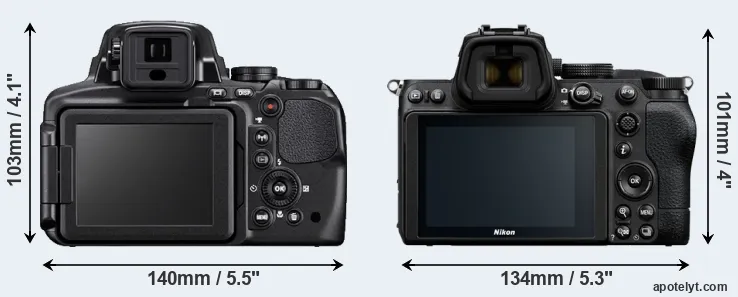 If the front view area (width x height) of the cameras is taken as an aggregate measure of their size, the Nikon Z5 is notably smaller (6 percent) than the Nikon P900. It is noteworthy in this context that the Z5 is splash and dust-proof, while the P900 does not feature any corresponding weather-sealing.